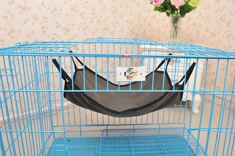 It can be hung in cage with four loops around its corner. Both sides are made of polar fleece, very comfortable to sleep.